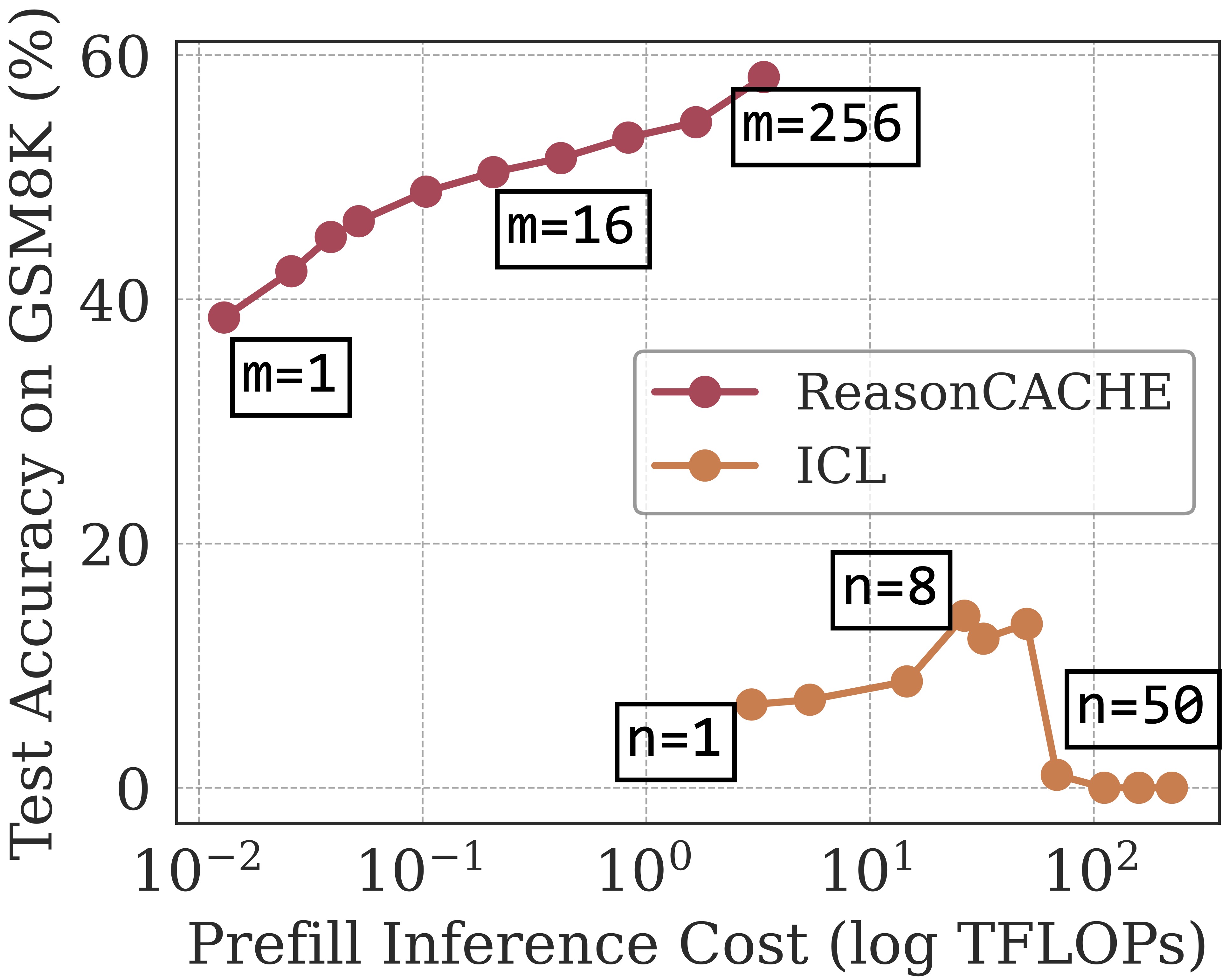 (a) ReasonCACHE Reduces Prefill Cost. As shown in the figure below (left), ReasonCACHE dominates ICL, outperforming the best ICL configuration by 44.8 points while using