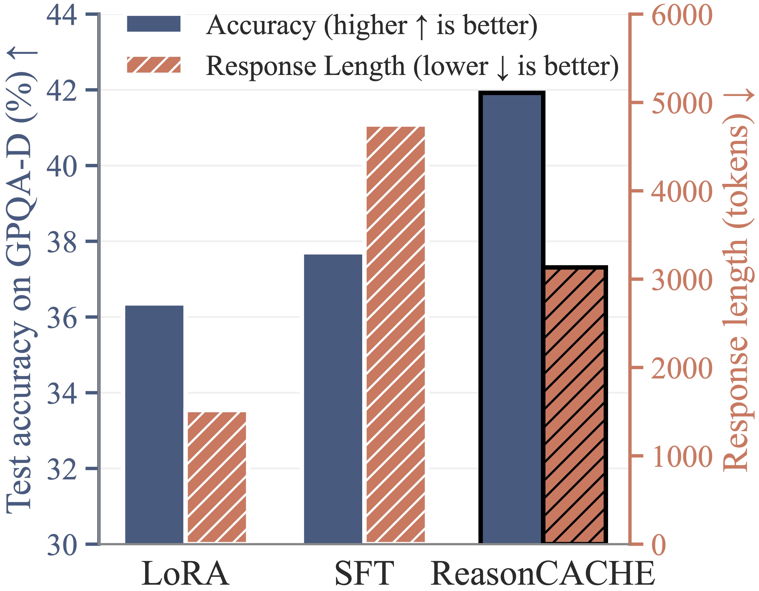 (b) ReasonCACHE Reduces Generation Length. As shown in the figure below (right), on long-form reasoning tasks such as GPQA-D,