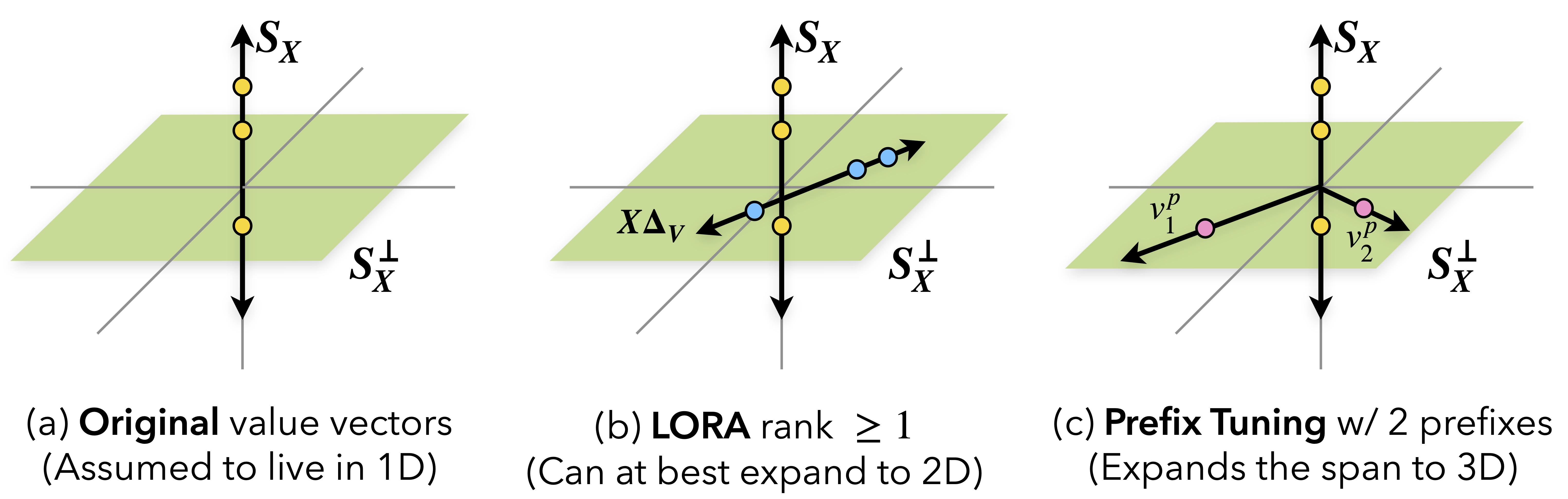 rank $r$. (c) Prefix tuning even with two prefixes can span the full 2D space $S_X^\perp$,